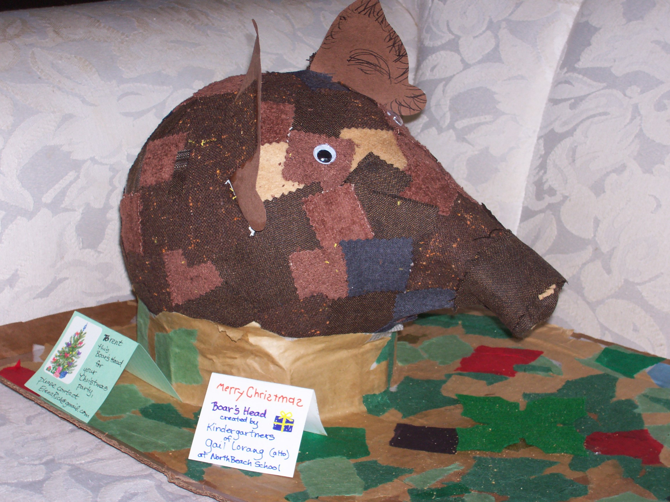 I’ve had a pig at my table for two weeks.Actually a boar, not a pig.And only the head.A boar’s head.OK, it’s paper maché.I wanted one so the OK Chorale could process singing “The Boar’s Head Carol.”One of our altos, Gail, who teaches kindergarten at North Beach Elementary, volunteered her class to create a boar’s head.