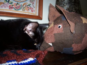 The boar’s head came wee, wee, wee all the way home with me so I could get it ready for the dress rehearsal.I made a paper maché collar and attached it to its own platter.I re-wrapped the snout and re-attached the nostril.By then I was so fond of it, I gave it some cookies and left it on my table where I could enjoy it until its big night.