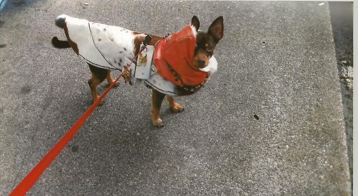 Little Marvin was swathed in a fur cape with an orange hood to protect him from the cold. Karen had added beaded tassels to the hood and flaps of leather festooned with pirate heads to the cape. Marvin almost disappears inside this regalia except for his little legs that scurry him around.