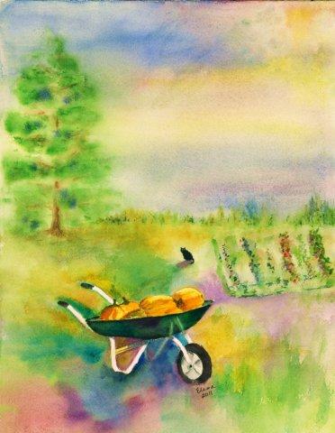 This week I finished a painting inspired by a photograph of a wheelbarrow full of pumpkins, and Eugene, my first little soul-mate cat. He’s the cat who liked raisins, broccoli and ear wax –I don’t need to get into how that came about—and who played my answering machine when he was bored.