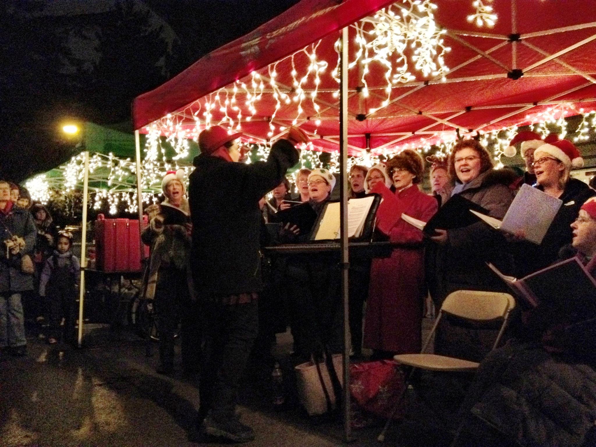 The OK Chorale has sung at the luminarias for 15 years.  For most of those years, it’s rained.  The poor little candles go out and the bags wilt but we carry on.  True Northwesterners come out in their rain gear.  One year it snowed big, fat flakes. Another year we sang on a full moon.