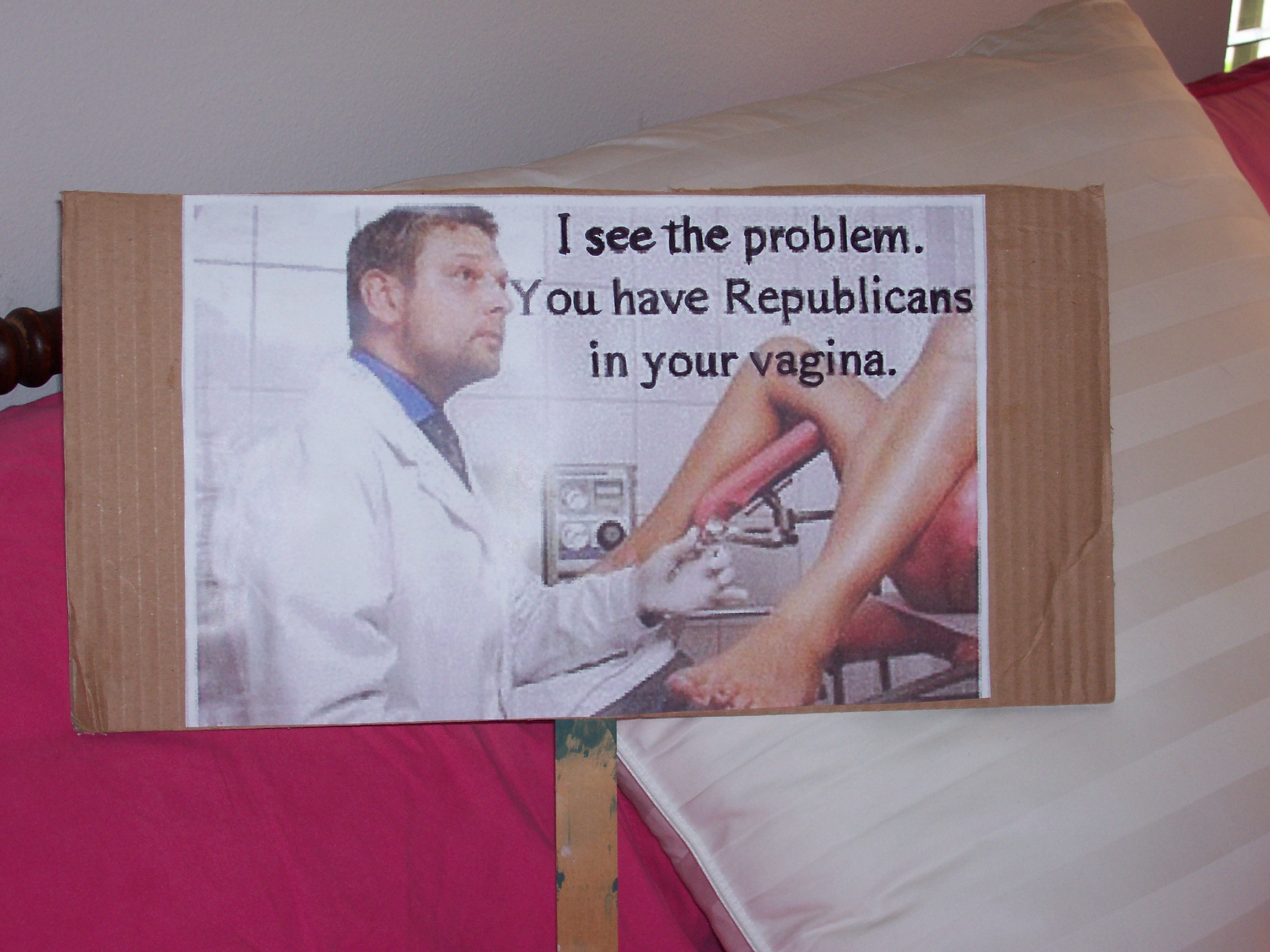 But Nancy suggested we go together and take signs.   Slogans poured out of her like water.  We settled on these: Ejaculation is a Choice.  Preach Condoms.  Conception Begins at Erection.  I decided that I would go all out and get a poster made from a cartoon that I have been circulating quietly among my friends because I am just middle-aged enough to feel self-conscious about the word vagina