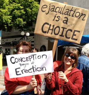 There were a lot of great signs at Westlake. The only one I didn’t like was: “No Uterus? No opinion.”   I don’t agree with that.  I know the risk we run with allowing uterus-less persons to have opinions is that they may have the Wrong One. (For the one or two fundamentalists mistakenly reading this blog, that is a joke.) But the larger point is that if you are male and want your opinion about pregnancy, abortion and birth to be respected, than you’d better plan to spend 20 years of your life shouldering 50% of the responsibility for the consequences of your sperm.