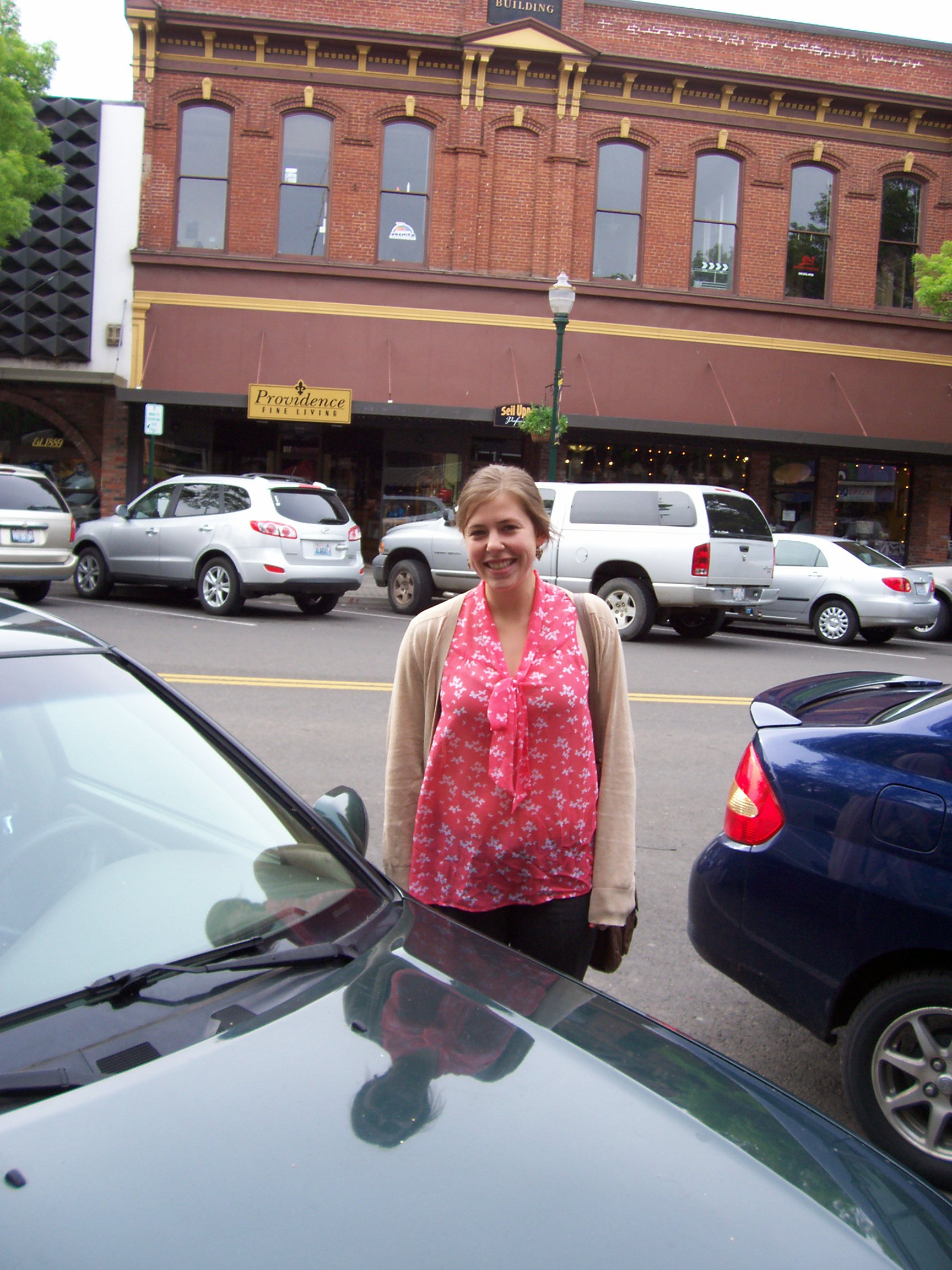 Katie on Main Street outside Olive's and down the street from Bright's Candies