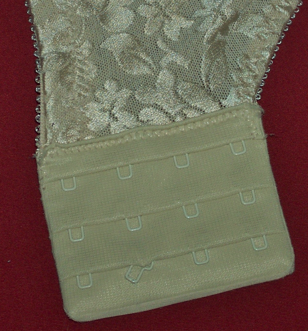 I bought the bra. I hook one hook onto one eye on the last row of hooks. You can see it pulling out of line, a hook after my own heart. I figure that when it comes out completely I have three more to go through before I have to buy another bra.