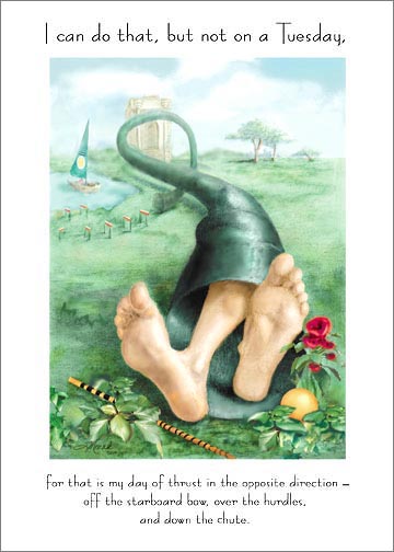 There’s an idea for the rest of my life. Though I wouldn’t care to put myself through a pipe, I like the idea of thrusting in the opposite direction one day a week.  .   . at least one day a week.