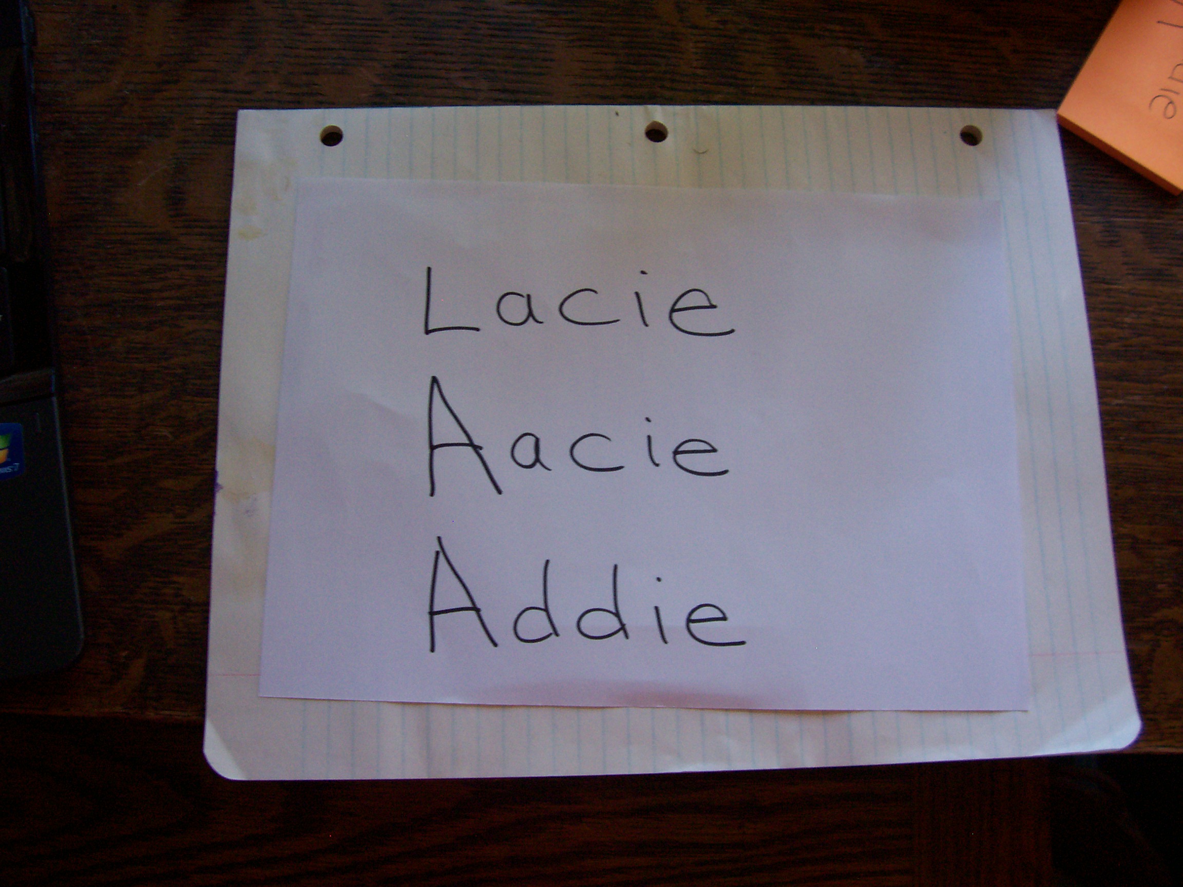 I extended the long line of the “L” of Lacie and added another joined at the top to create a lopsided A. I put lines on the right side of the “a” and the “c” to create two “ds.” Addie appeared.