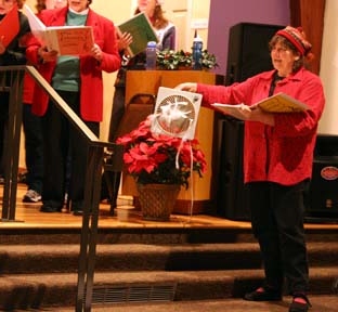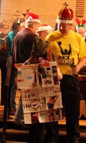 Verse Three: The Page and the Good King get together a wine bottle supplied by Anne, and the rubber chicken supplied by Sandi (alto) that doubles as one of the French hens for “The Twelve Days After Christmas.” At first mention of the wind, Jody (soprano) Eileen and Chris ( tenors) and Kristin ( alto) fan the air (mostly in the direction of the director at the piano.)