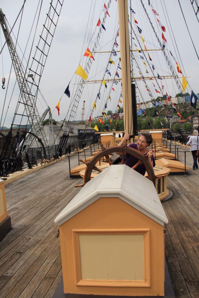 We disembarked at the SS Great Britain, a 19th century vessel that sailed all over the world as a passenger and then a cargo ship. It was built by a man with the unlikely name of Isambard Kingdom Brunel. Sue and I wandered through the ship trying to keep ahead of a class of school children. Neither of us likes to read and inspect everything so we travel well together. Sue is a photographer; she took photos. I did all the interactive stuff for children.