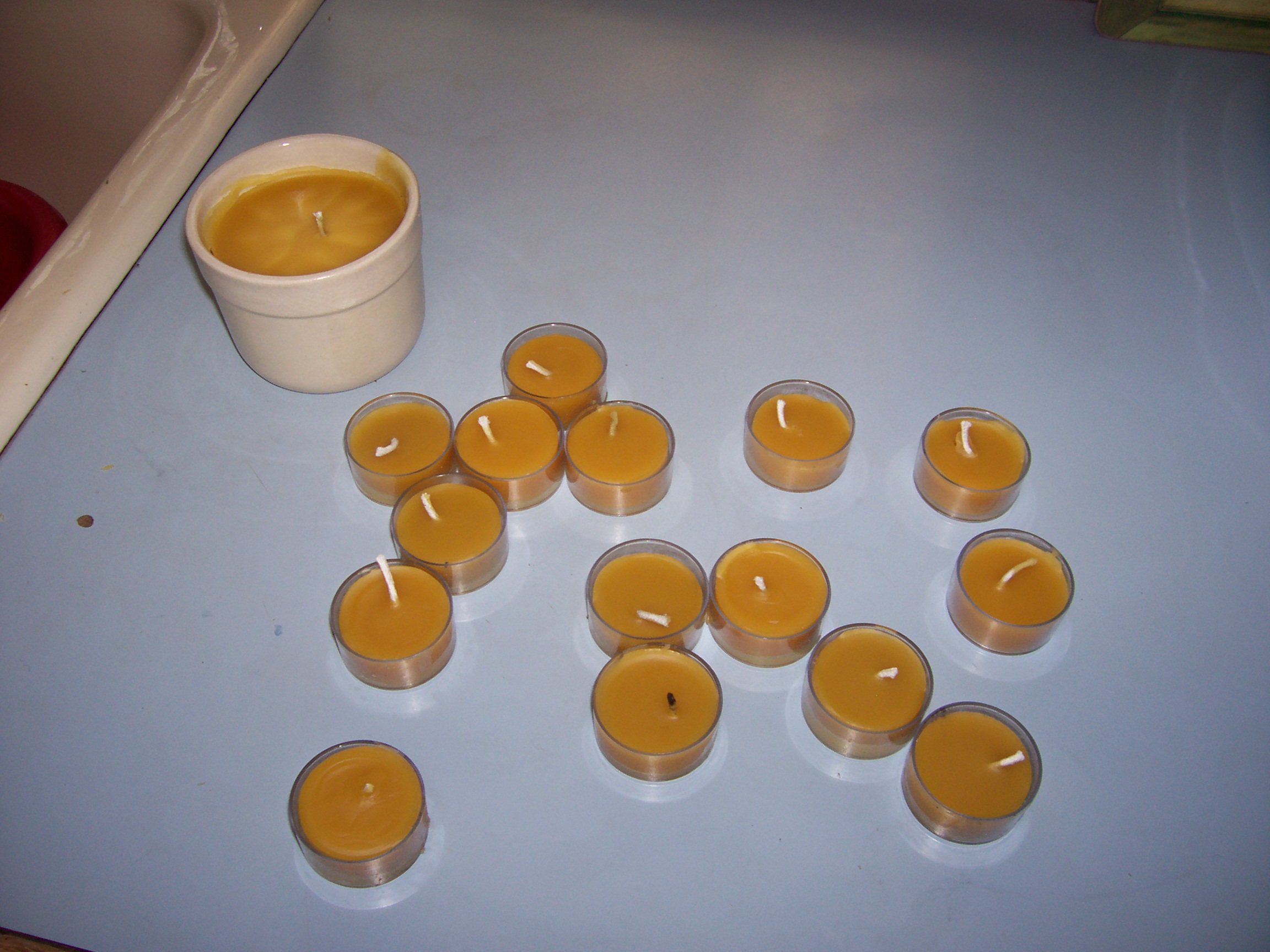 Anyway, these pine-cone shaped candles burn efficiently and cleanly, often with very little wax left. But I manage to collect a small saucepan of wax bits by the end of the year. I like to melt them down and pour tea lights.