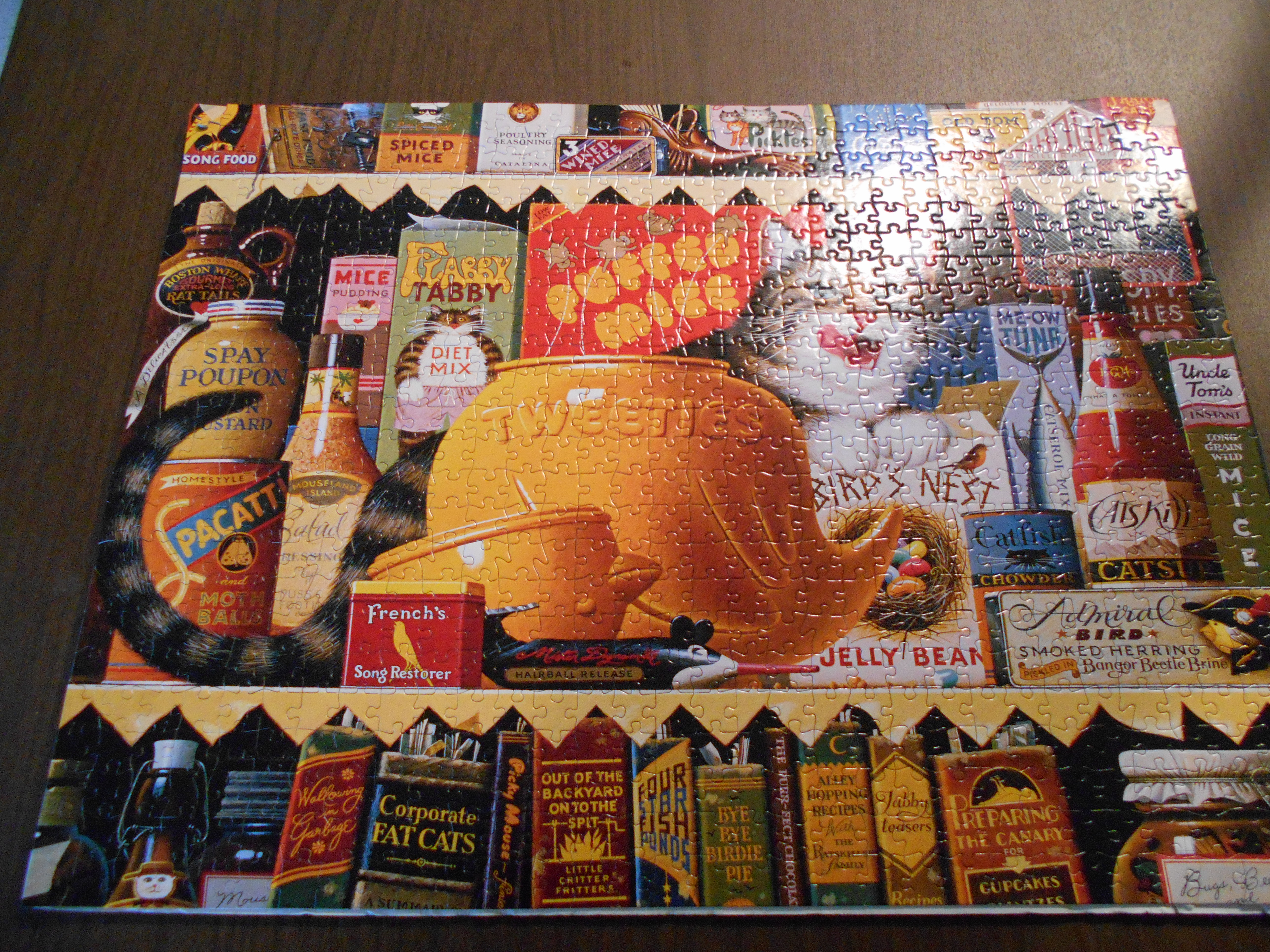 When I have planned to ruin my day by working on my taxes, a puzzle is so much more satisfying. It calls to me more insistently than even the refrigerator.  I can’t walk past it without sitting down and becoming engrossed. My shoulders and neck get unhappy, I’m up past my bedtime, the sink is perpetually full of dishes, the cats are perpetually whining but for hours and hours I don’t worry about my health care, the cruelty of the immigration deforms—yes, you read that correctly— the stupidity of the department of education or the treatment of women all over the world.   There’s always tomorrow and I am temporarily out of puzzles.