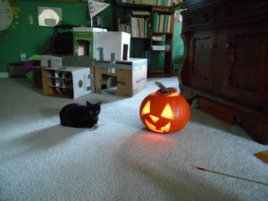 Regarding the smallest of the grazers, Hamlet is coming along. He is now consistently in the room with the other cats, with me, and with whoever has come in the front door. He and Laertes play, fight and sleep together. Hamlet plays with anyone who pulls his favorite mouse toy in front of him. He lets me stroke him occasionally but more often leaps up in alarm, retreats and watches suspiciously. He really does live up to his name: quietly and mutely suspicious. Other than that, he knows the hour of treats and he has a persistent little meow.