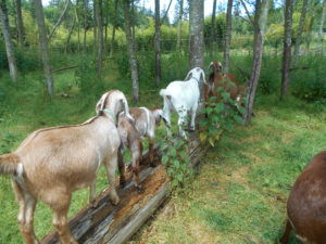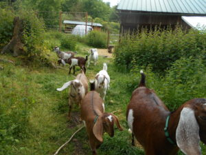 The goats have stripped every tree limb they can reach—they like alder and maple leaves—so I pull down the higher branches and let them munch. They climb all over each other, the nanny and me to get as much as they can for as long as I am willing to stand there. I noticed the first time I did this, the two littlest kids wanted to join in but weren’t quite sure what we were doing. When they figured out they could eat these green things, they held their own with their older siblings.