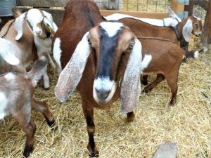 The two new kids are about three weeks old but are already so big it takes a minute to sort them out from the pack. A male and a female, they both have white spots on brown and black hair like dog markings. The spotted bull in another pen is clearly the sire. The long-suffering nanny with the wondrous udder impeding her every move and seven kids pestering her is the mother.