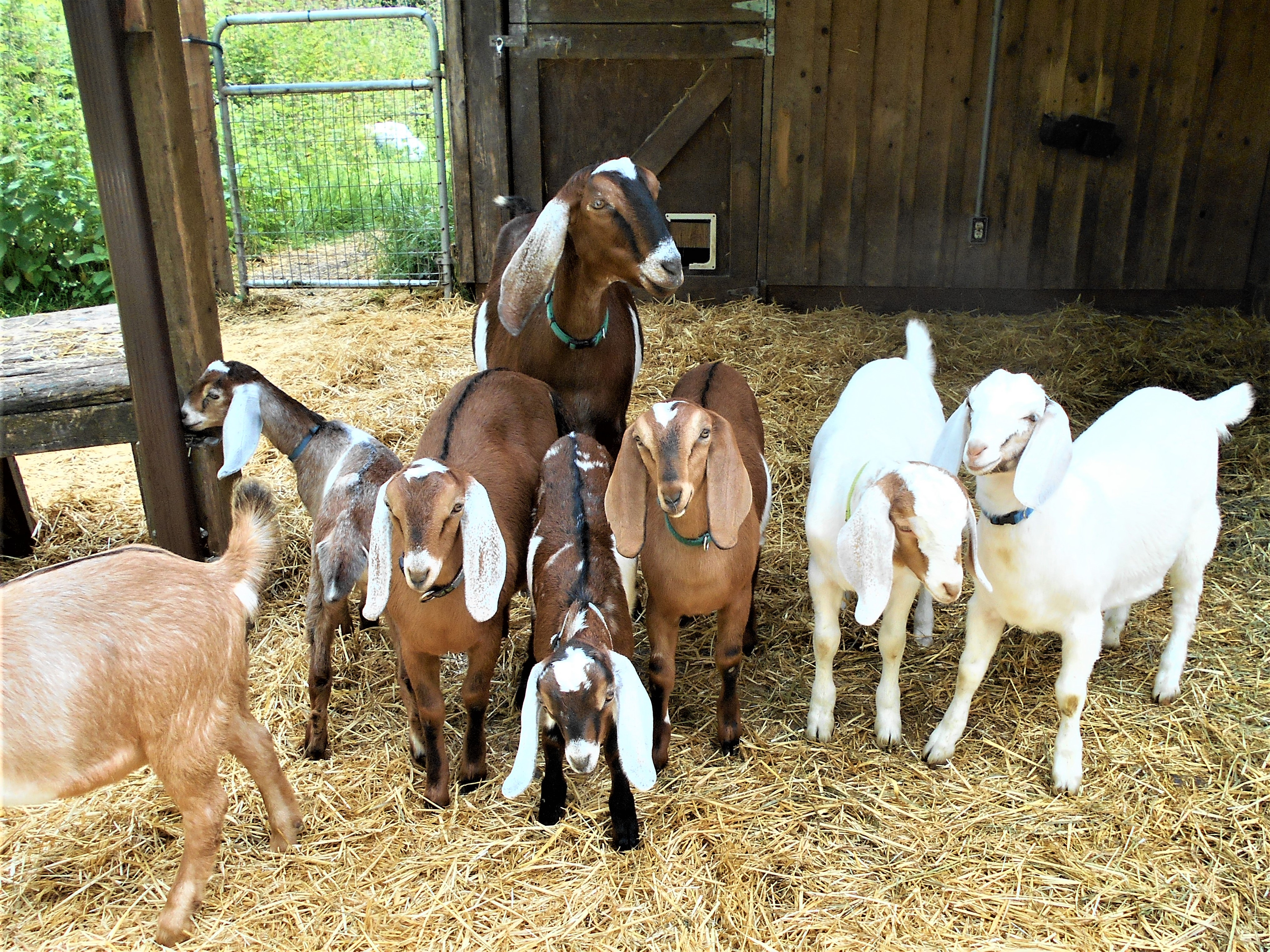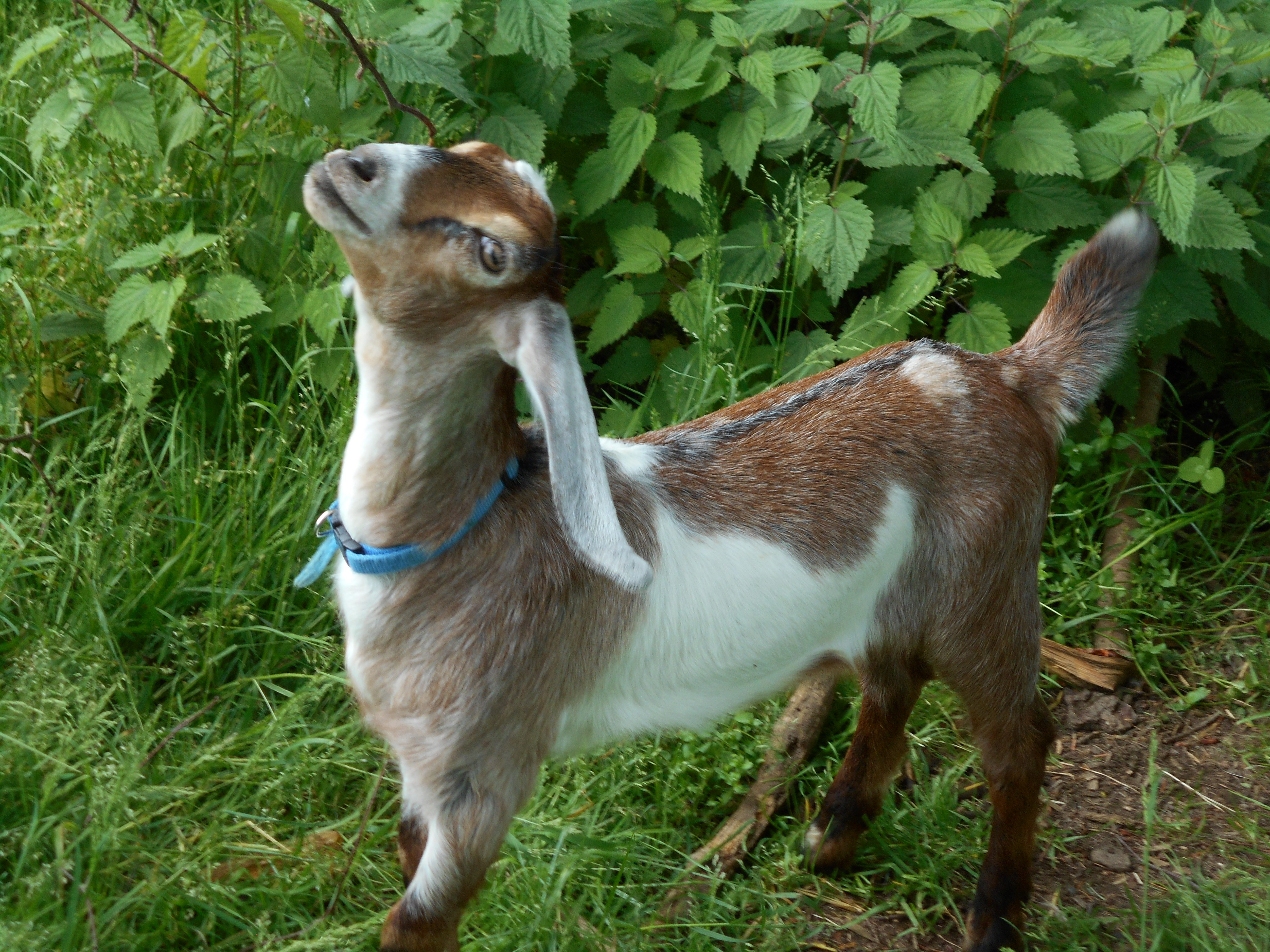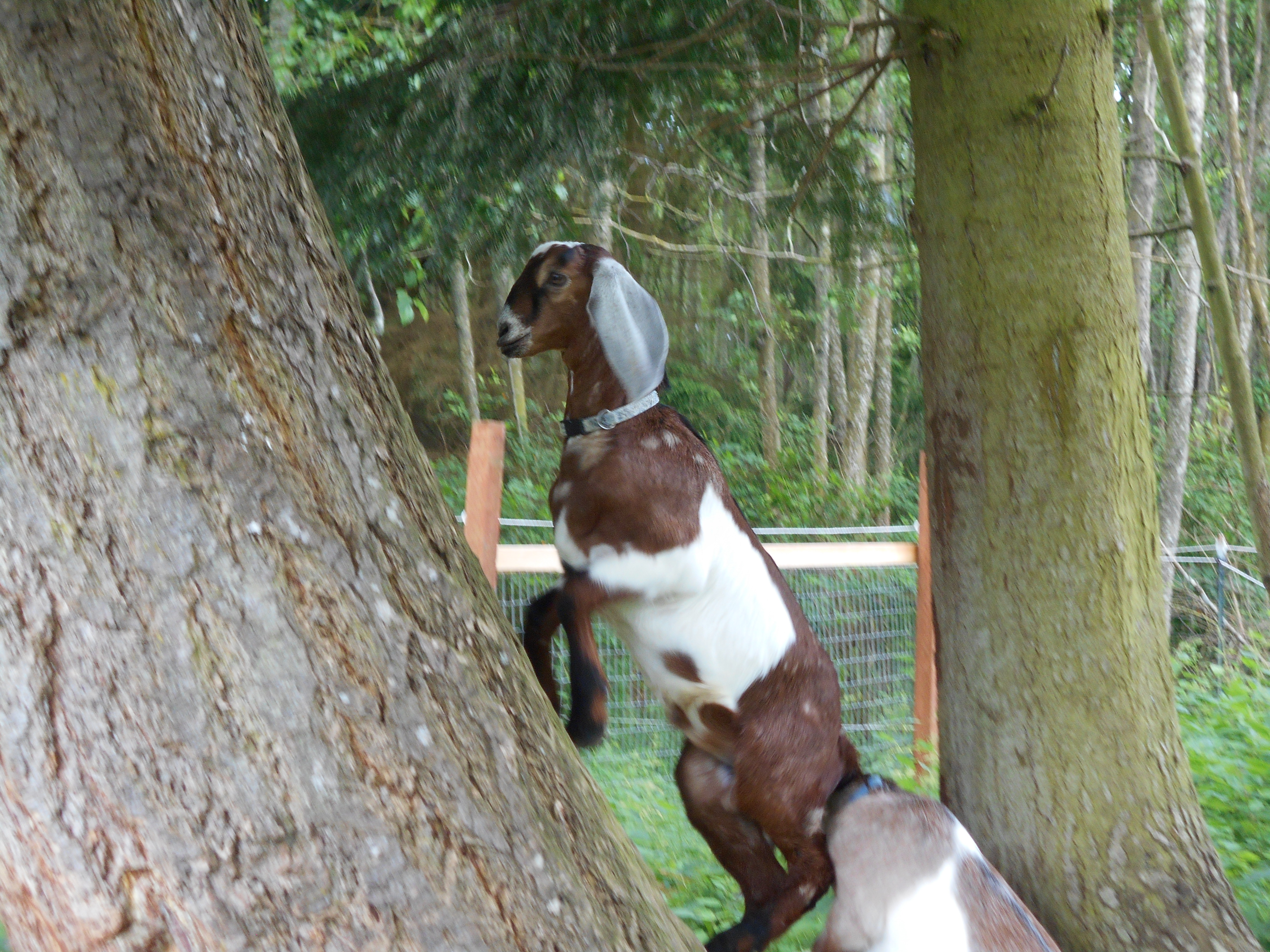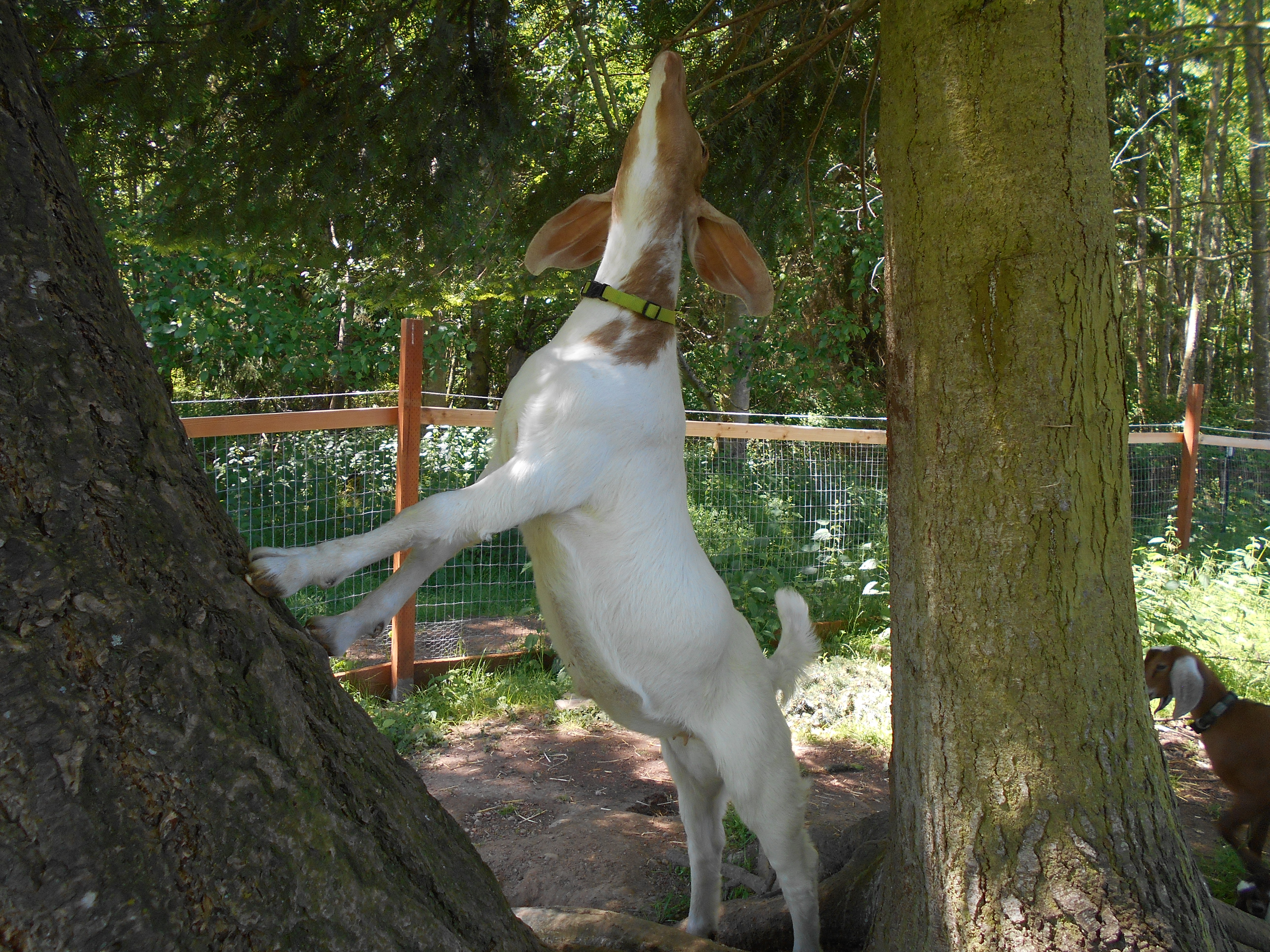 The goats have stripped every tree limb they can reach—they like alder and maple leaves—so I pull down the higher branches and let them munch. They climb all over each other, the nanny and me to get as much as they can for as long as I am willing to stand there. I noticed the first time I did this, the two littlest kids wanted to join in but weren’t quite sure what we were doing. When they figured out they could eat these green things, they held their own with their older siblings.