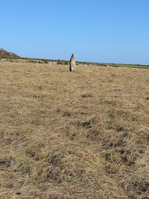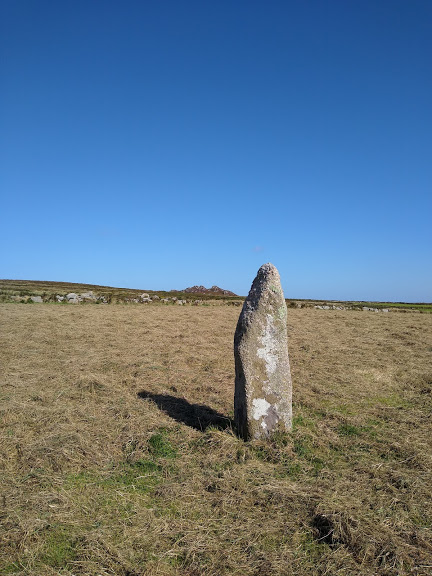 Up the road from Men-an-tol is Miscellaneous Standing Stone in a Field, which –after I had communed with it—I learned was called Men-scryfa or “stone of writing.” It stands there like a still life with the presence of that terrifying statue of Dante in Florence. Or “Christmas Yet to Come” in Mr Magoo’s Christmas Carol.  See? I don’t know what to make of these stones. There is an inscription on the stone that seems to call itself (in Gaelic) “grave of Rigalobranos, son of Cunoualos.”