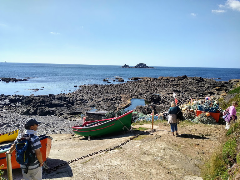 On to the glorious expanse of Cape Cornwall, a National Trust reserve where walking trails take one to the highest point of a headland and the Coast Watch. We finally got our morning cup of tea in bone china cups at the tea hut and sat on logs in the warm sunshine.