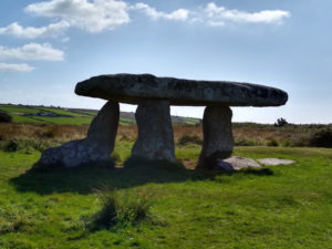 Pursued by a tractor, we carried on down a different road to Lanyon Quoit, a dolmen. As far as I can make out, a dolmen is a table made of three stones and a quoit is the top of the table. So they are basically the same thing except they aren’t tables at all. They are the remains of a tomb: two tall stones supporting a flat one, in the case of Lanyon Quoit, three tall stones. Lanyon Quoit can be seen from the road but to actually get to it, we traversed a brick stile and walked up a wide green path.