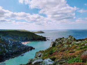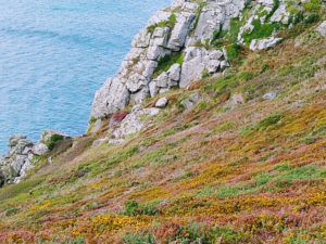 The next morning Sue popped her head round my door to say, “Oh Elena, you’ll want long pants. There are stinging nettles” and I had that sense of being a seven year old with my parents. We were to walk the cliff path that begins with the public footpath next to the church and hooks up with the Cornish Coastal path. The rugged coastal path extends from Minehead up in Somerset all the way around Cornwall to Poole in Dorset. Parts of it are easy but parts have huge boulders to negotiate and an unforgiving rocky path. Wendy has walked a good deal of the coastal path. Her assessment of our little bit was that it was of middling difficulty.