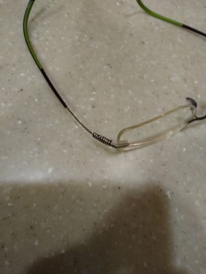 He ended up super gluing the two ends and wrapping the whole business with hot silver wire. One arm was a little shorter than the other but the glasses fit much more securely.