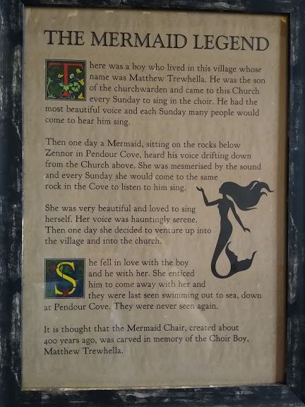 Wendy and Sue mentioned it so many times I was expecting to see a statue of a mermaid lounging on a giant throne in the center of the nave. But it was a quiet little wooden bench about 400 years old with a carving of a mermaid on one side. St Senara is a Celtic saint like St Just and St Erth and I believe St Bridget of Sweden.