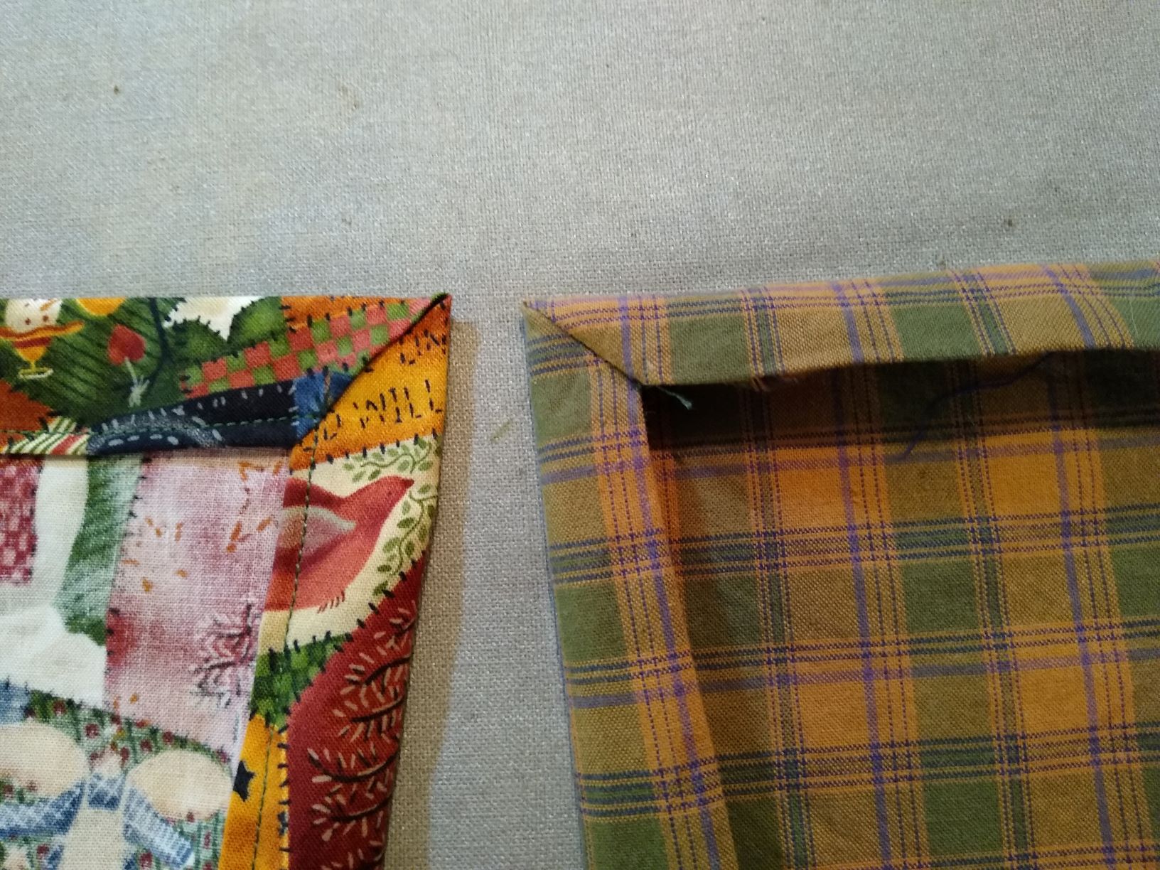 I started with mitered corners on a table runner. I got three out of four corners mitered before I almost cried over the fourth one. I folded up the runner and put it with the green shirt.