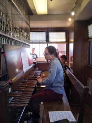 Besides falcon poop, there is a magnificent carillon up there. We were there in time for the noon concert. I watched the young woman go at the keys and the pedals for “Bonnie Doon” with my fingers plugging my ears. I never thought I could have an experience like that outside of Europe.